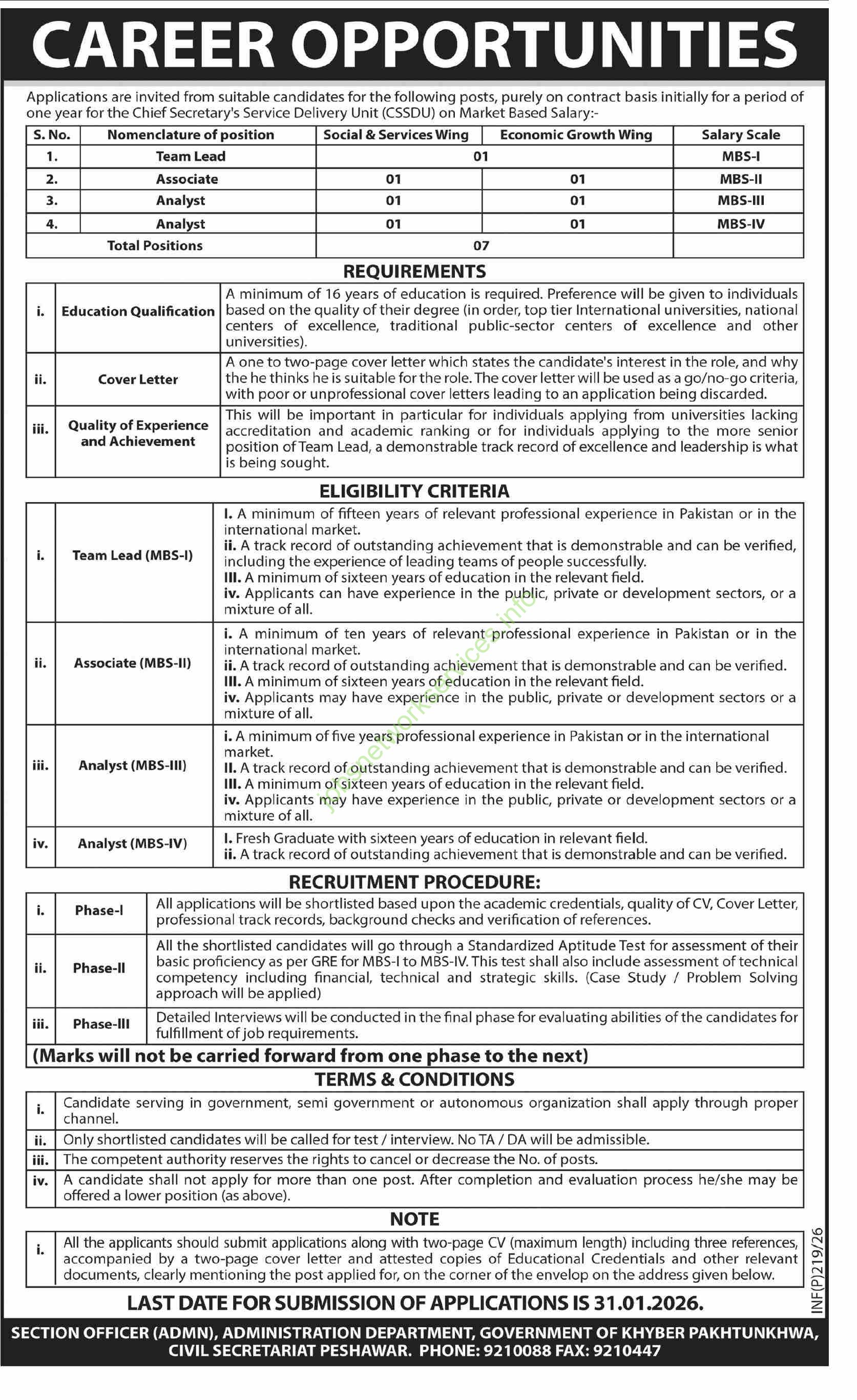 Job Title: Various positions at the Chief Secretary’s Service Delivery Unit (CSSDU), Government of Khyber Pakhtunkhwa