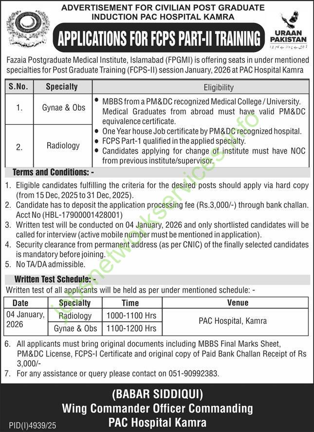 Okay, the advertisement is for FCPS Part-II training positions at PAC Hospital Kamra under the Fazala Postgraduate Medical Institute. There are two specialties listed: Gynae & Obs and Radiology. The eligibility criteria include MBBS from a recognized institution, a one-year house job, and FCPS Part-1 qualification.