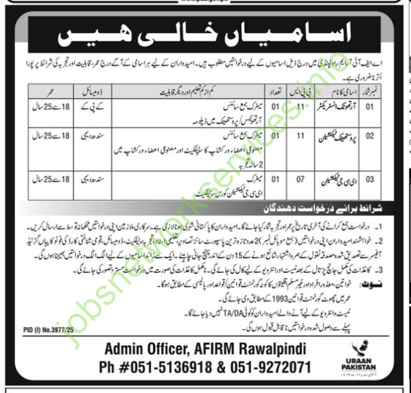 اے ایف آئی آرایم راولپنڈی میں درج ذیل اسامیوں کے لیے درخواستیں مطلوب ہیں۔ امیدواران کے لیے ہر اسامی کے آگے درج عمر ، قابلیت اور تجربہ کی شرائط پر پورا اترنا ضروری ہے۔