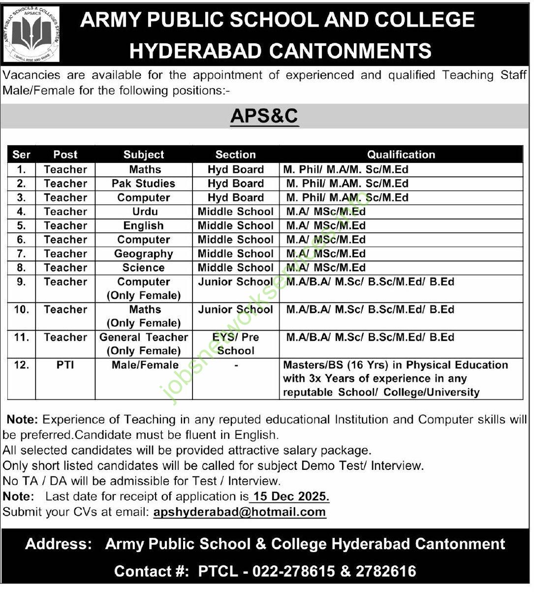 Army Public School and College Hyderabad Cantonments Jobs December 2025 Latest