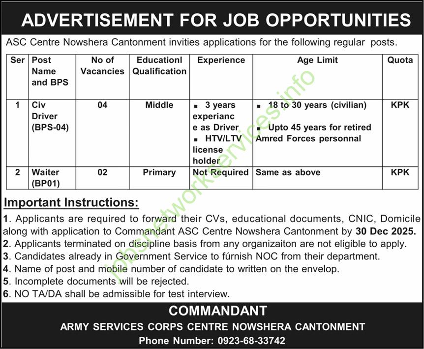 1. Applicants are required to forward their CVs, educational documents, CNIC, Domicile along with application to Commandant, ASC Centre Nowshera Cantonment by 30 December 2025.