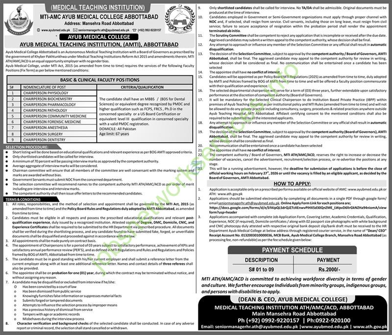 Ayub Medical College, under MTI Act, 2015 (as amended from time to time) requires the services of the following Faculty Positions (Fix Term) as per below mentioned conditions: