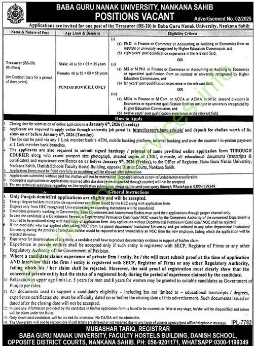 - The applicants are also required to submit signed hardcopy/printout of same pre-filled online application form THROUGH COURIER along with recent passport size photograph, attested copies of CNIC, domicile, all educational documents (transcripts & certificates) and experience certificates on or before January 9, 2026(Friday), to the Office of Registrar, Baba Guru Nanak University, Nankana Sahib, Danish Schools Faculty Hostel Building, opposite District Courts, Nankana Sahib.