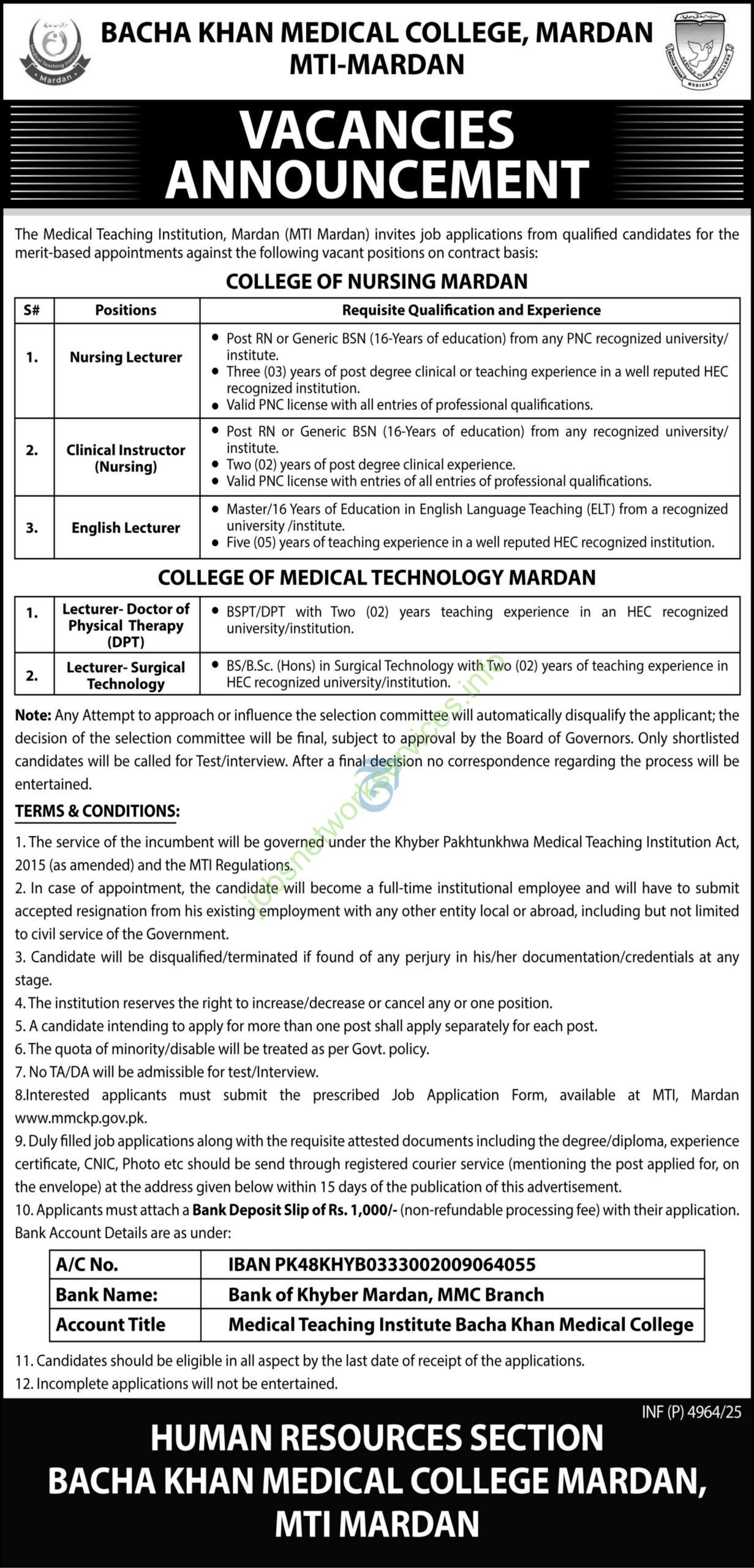 Bacha Khan Medical College, Mardan (MTI-Mardan) has announced multiple contract-based job openings in its College of Nursing and College of Medical Technology. Applications must be submitted within 15 days of the advertisement’s publication.