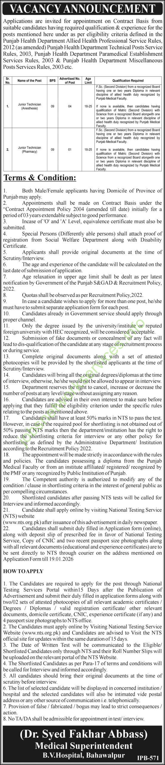 You should immediately visit the official NTS website (www.nts.org.uk) and the website of Bahawal Victoria Hospital or the Punjab Health Department to find the original, clear advertisement to see the exact posts, vacancies, required qualifications, and experience before applying.