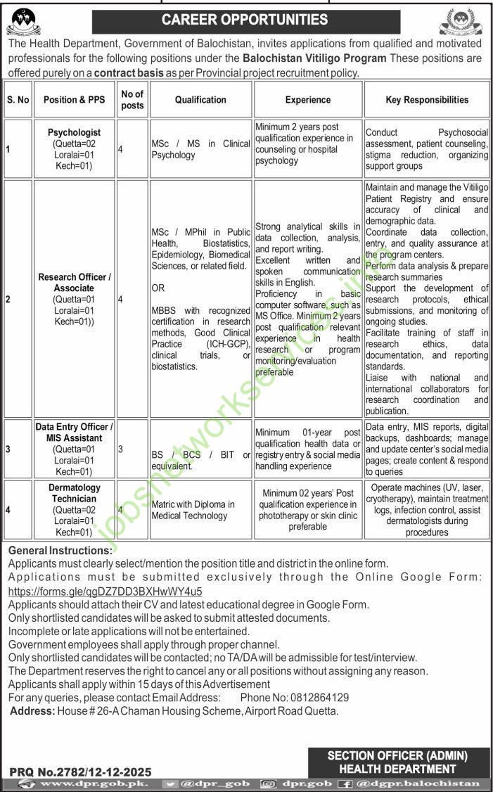 Balochistan Health Department New Jobs December 2025 Latest