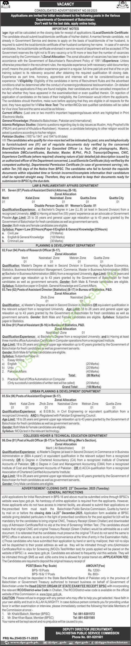This is Consolidated Advertisement No. 08/2025 from the Balochistan Public Service Commission (BPSC). It announces multiple vacancies across various departments of the Government of Balochistan. The closing date for applications is December 23, 2025.