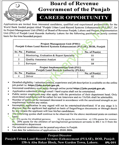Applications are invited from qualified and experienced professionals for the following positions in the World Bank-funded project “Punjab Urban Land Record Systems Enhancement (PULSE).” The positions are on a purely contract basis and are located in Lahore.