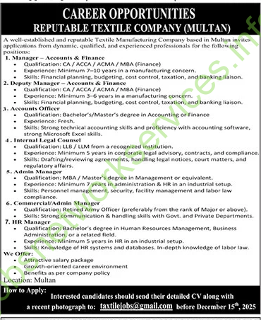 A reputable textile manufacturing company in Multan is seeking qualified and experienced professionals for several key positions. The company offers an attractive salary package and a growth-oriented environment.