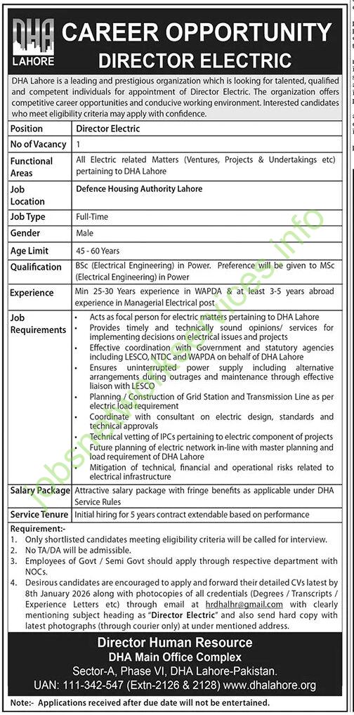 Job advertisement from DHA Lahore, here is a structured summary and analysis of the Director Electric position: