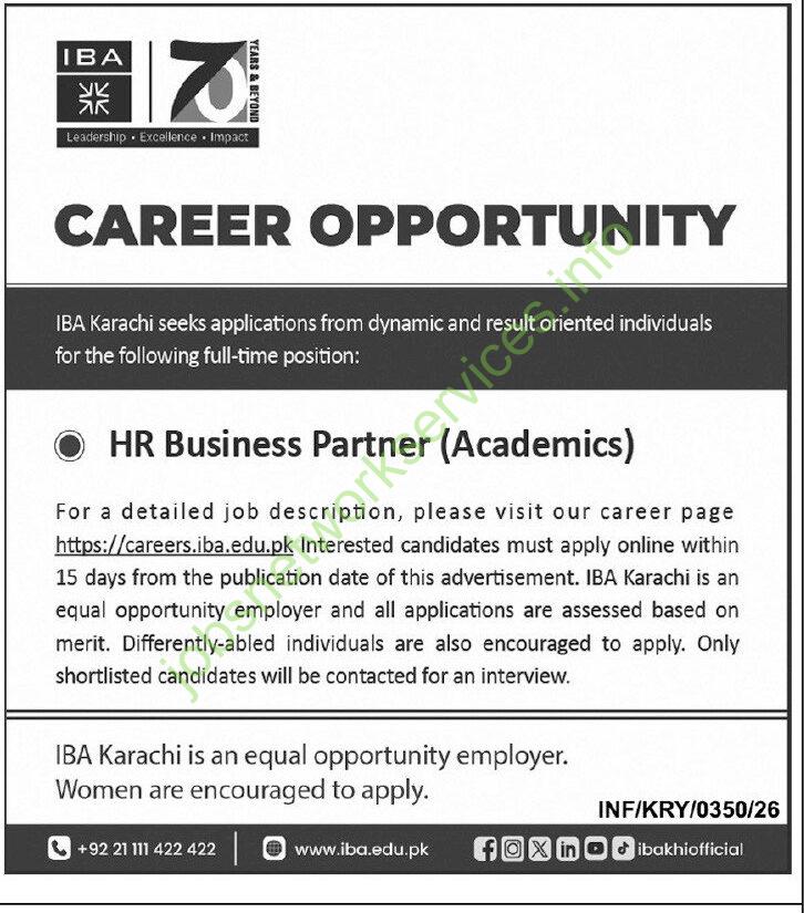 For a detailed job description, please visit our career page: https://careers.iba.edu.pk. Interested candidates must apply online within 15 days from the publication date of this advertisement.