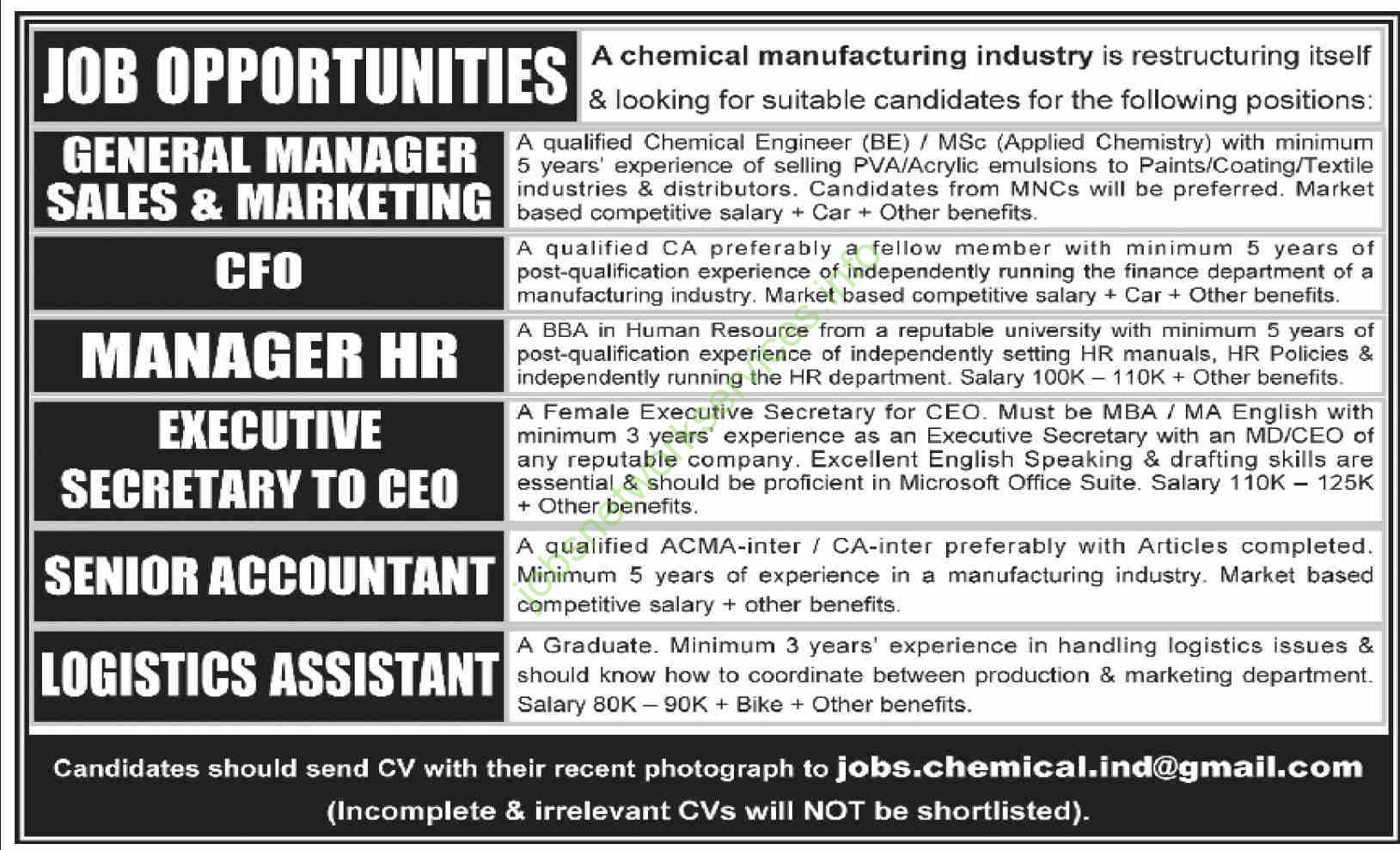 • Send your CV with a recent photograph to: chemical.ind@gmail.com