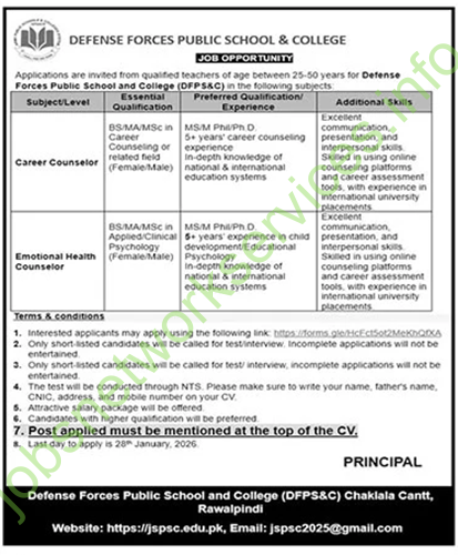 Applications are invited from qualified teachers of age between 25-50 years for Defense Forces Public School and College (DFPS&C) in the following subjects