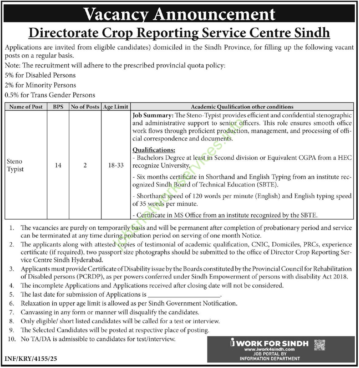 Directorate Crop Reporting Service Centre Sindh Jobs December 2025 Latest