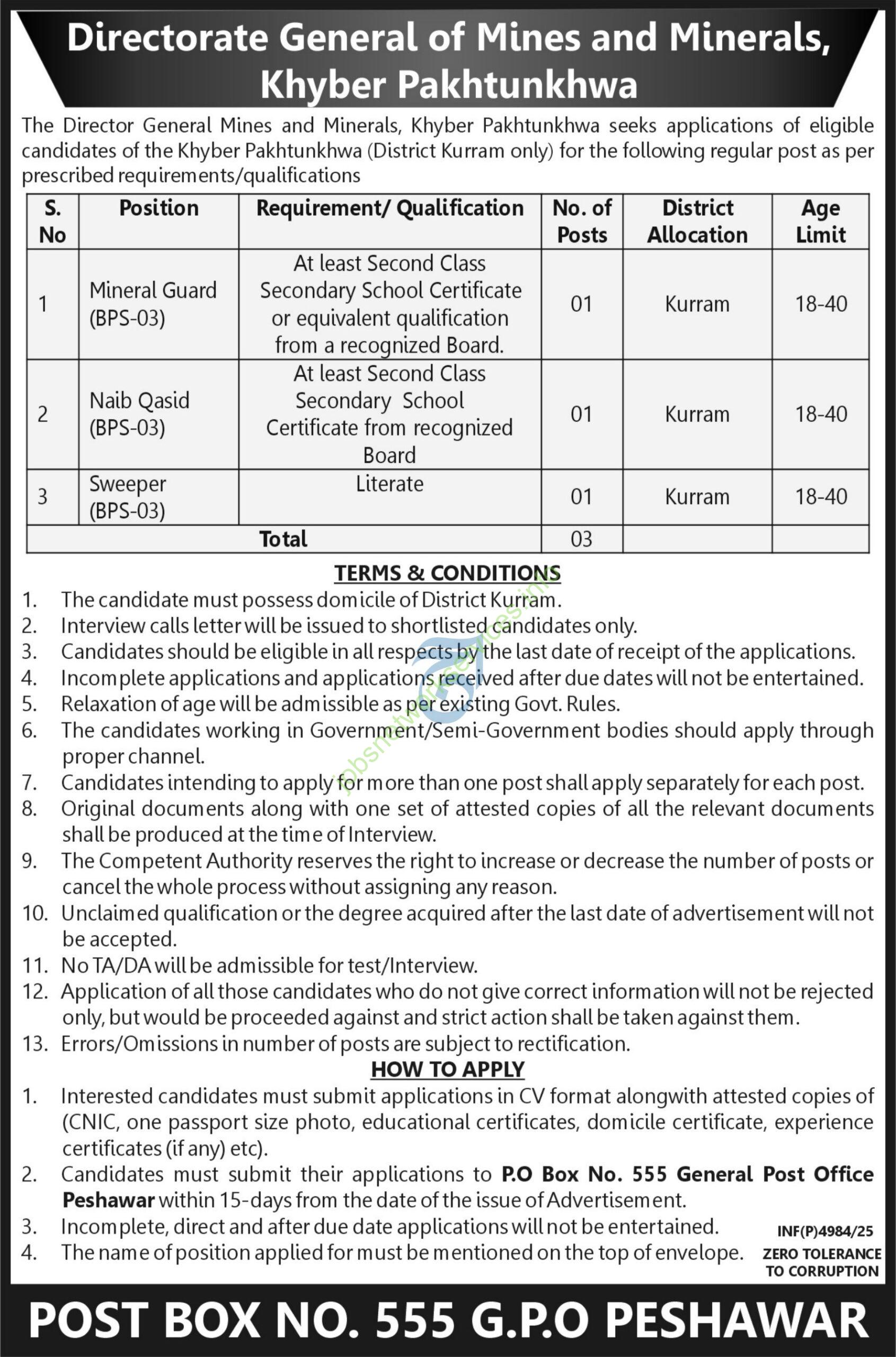 The Directorate General of Mines and Minerals in Khyber Pakhtunkhwa is hiring for three (03) regular positions based in District Kurram. Applications are invited exclusively from eligible candidates who hold a domicile of District Kurram.