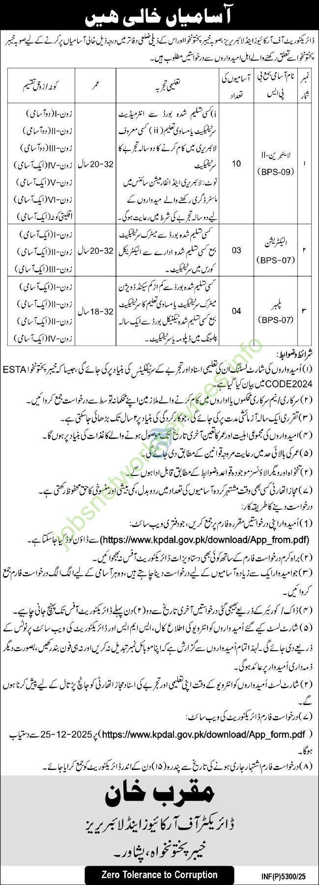 ڈائریکٹوریٹ آف آرکائیوز اینڈ لائبریریز صوبہ خیبر پختونخوا اور اس کے ذیلی ضلعی دفاتر میں درجہ ذیل خالی آسامیاں پر کرنے کے لیے صوبہ خیبر پختونخوا سے تعلق رکھنے والے اہل امیدواروں سے درخواستیں مطلوب ہیں۔