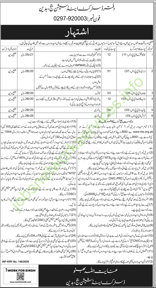 ضلعی اور ماتحت عدالتوں، بدین میں درج ذیل آسامیوں پر اہل امیدواروں سے درخواستیں طلب کی جاتی ہیں۔