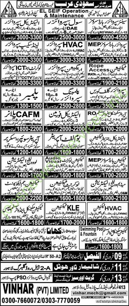 This image contains a detailed job advertisement for EL Seif Operation & Maintenance in Saudi Arabia, facilitated by VINHAR (Pvt) Limited. Below is the organized breakdown of the positions, requirements, and interview schedule.