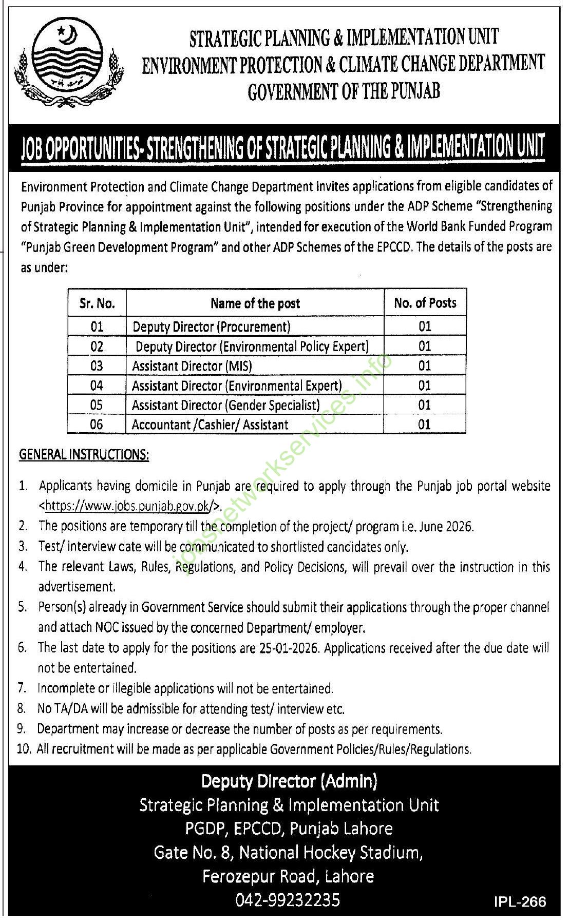 Project: Positions are under the ADP Scheme “Strengthening of Strategic Planning & Implementation Unit,” for the World Bank-funded Punjab Green Development Program (PGDP) and other schemes.