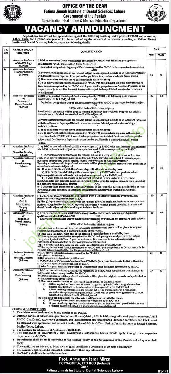 Applications are invited for appointment against the following teaching cadre posts of BS-18 and above, on Adhoc Basis, for a period of one year or till the arrival of regular incumbent, whichever is earlier, at Fatima Jinnah Institute of Dental Sciences, Lahore, as per the following details: