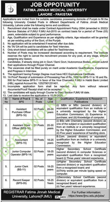 Fatima Jinnah Medical University (FJMU) in Lahore is inviting applications from eligible candidates domiciled in Punjab for several contract-based positions.