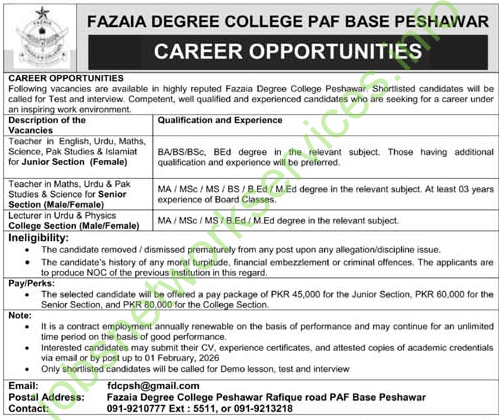 Here’s a summary of the job advertisement for Fazaia Degree College PAF Base Peshawar in a structured format: