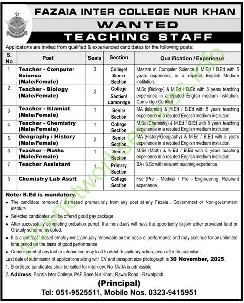 Fazaia Inter College, located at PAF Base Nur Khan in Rawalpindi, is recruiting teaching and support staff for the 2025 academic year.