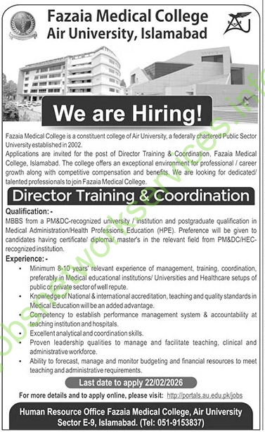 Contact Information: Human Resource Office, Fazaia Medical College, Air University Sector E-9, Islamabad. Tel: 051-9153837