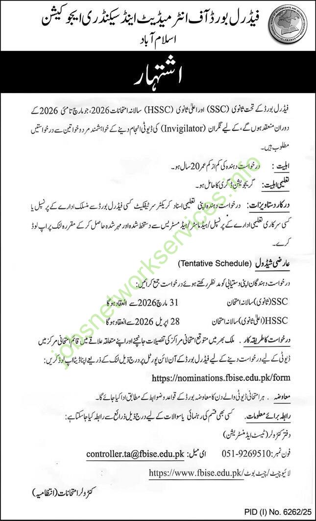 Applications are invited from interested men and women to perform Invigilator duties during the SSC (Matric) and HSSC (Intermediate) Annual Examinations 2026, which will be held between March and May 2026.