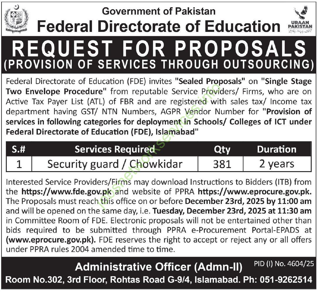 This document is a Request for Proposal (RFP) or tender notice from the Federal Directorate of Education (FDE), Islamabad, for outsourcing services. It is not a direct job advertisement for individuals seeking employment.