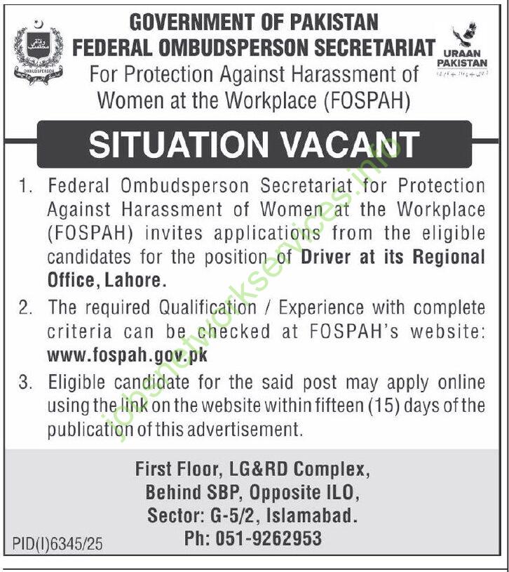 - Federal Ombudsperson Secretariat for Protection Against Harassment of Women at the Workplace (FOSPAH) invites applications from the eligible candidates for the position of Driver at its Regional Office, Lahore.