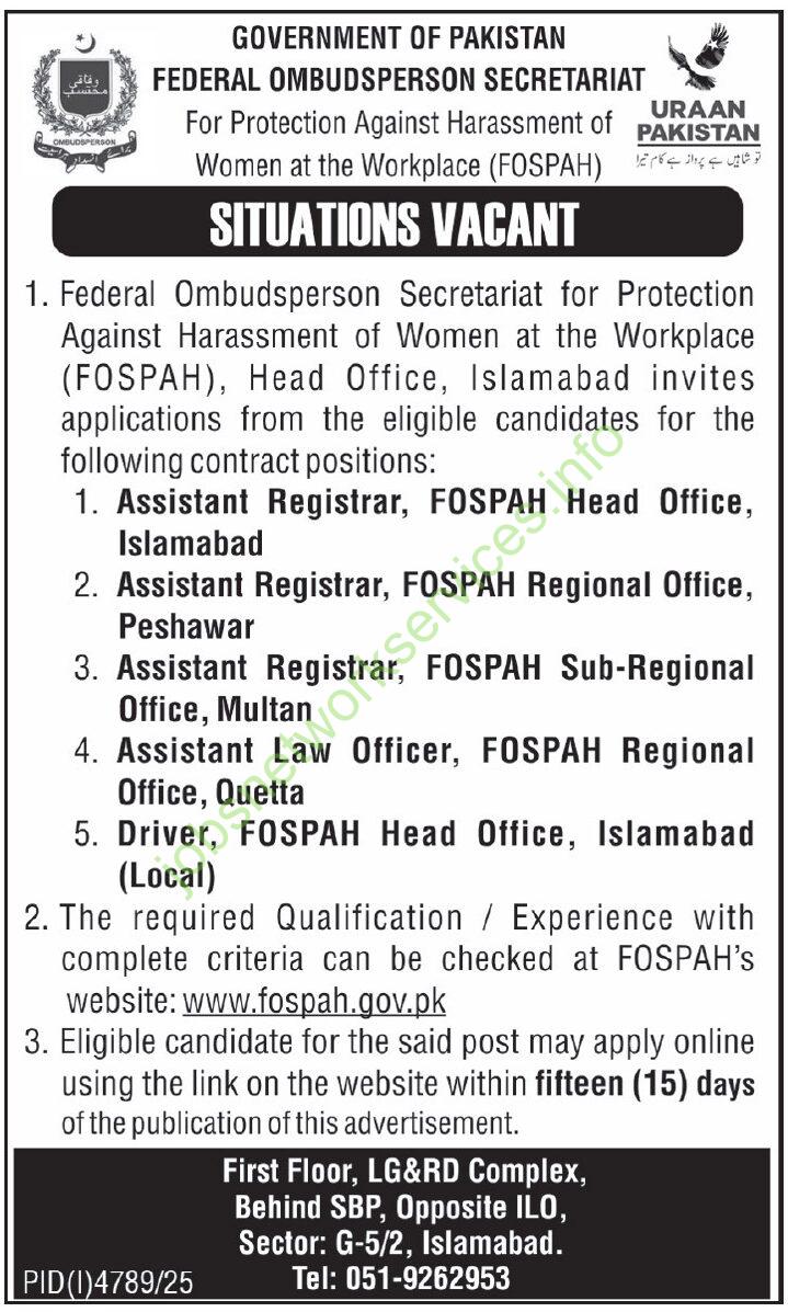 1. Federal Ombudsperson Secretariat for Protection Against Harassment of Women at the Workplace (FOSPAH), Head Office, Islamabad invites applications from the eligible candidates for the following contract positions: