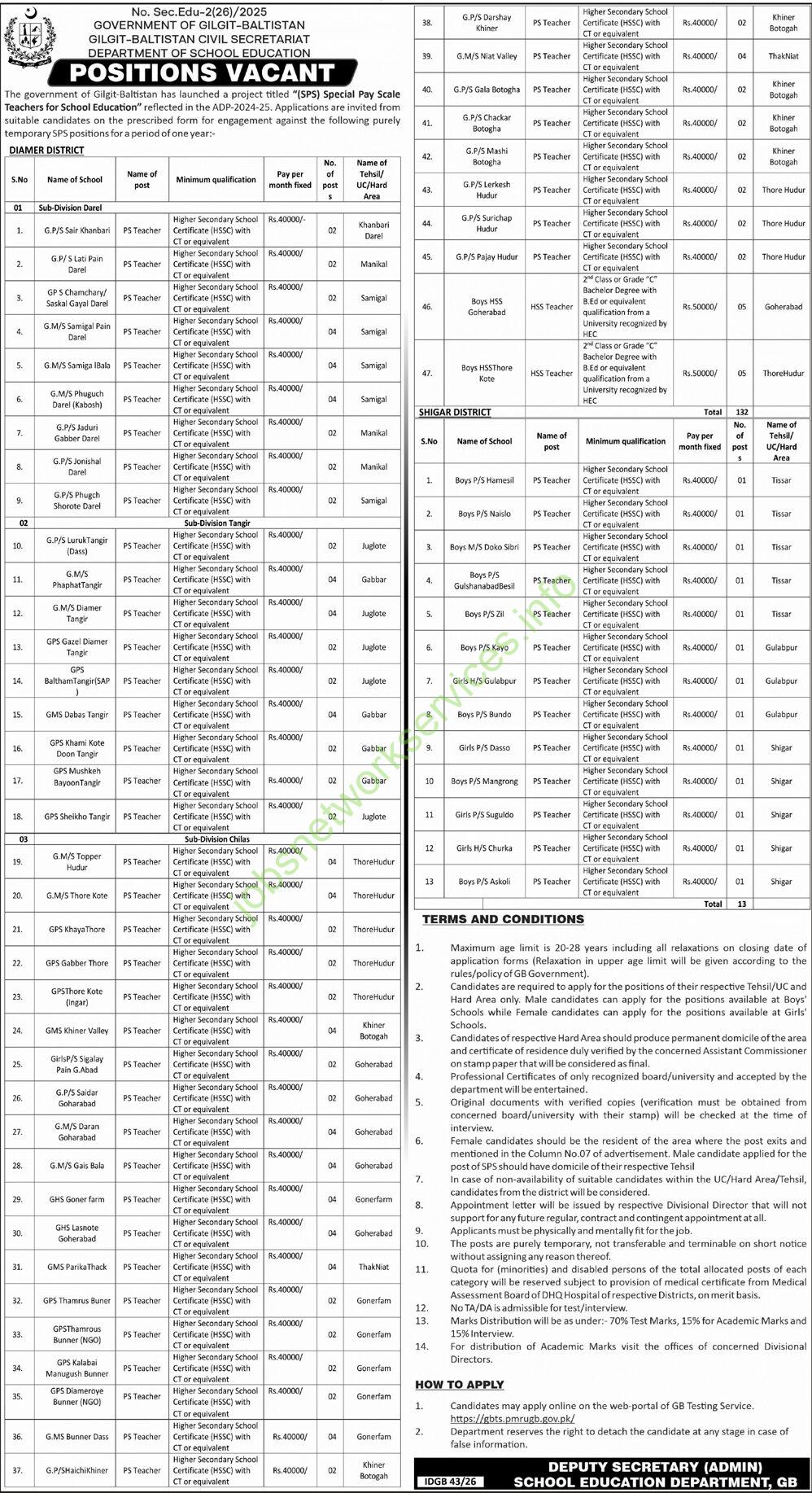 The government of Gilgit-Baltistan has launched a project titled “Special Pay Scale Teachers for School Education” reflected in the ADP-2024-25. Applications are invited from suitable candidates on the prescribed form for engagement against the following purely temporary SPS positions for a period of one year.
