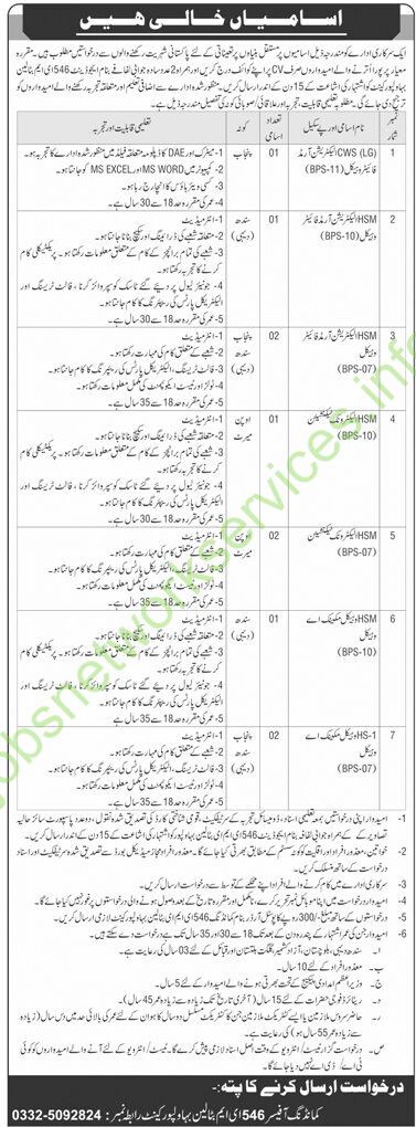 - All aspiring candidates must send their applications along with attested copies of their educational certificates, domicile, experience certificates, national identity card, and two passport-sized photographs in a reply envelope to “Ejabat 546 EM Bainin Bahawalpur Cantt” within 15 days of the advertisement’s publication.