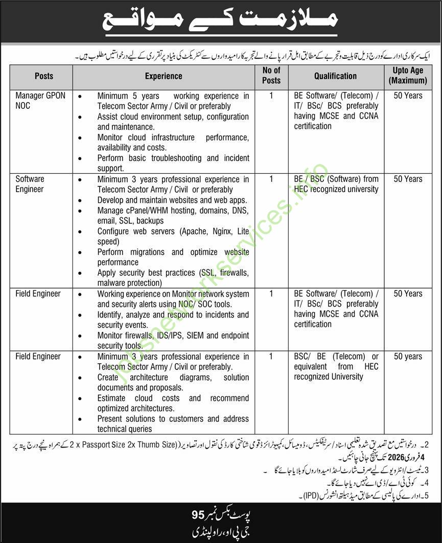 Here is a structured summary of the job advertisement from Post Box No. 95, GPO Rawalpindi: