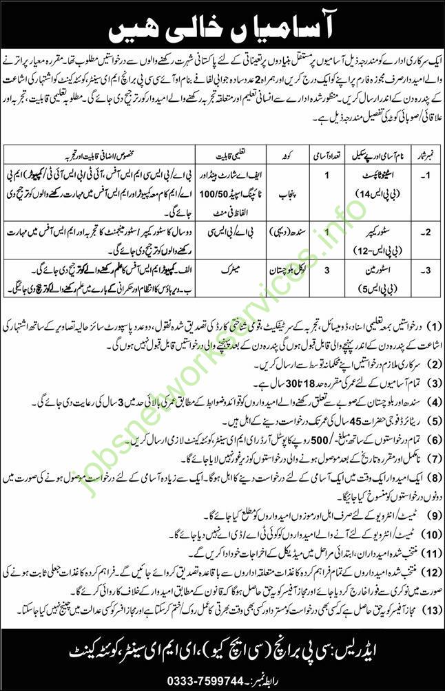 ایک سرکاری ادارے کو مندرجہ ذیل آسامیوں پر مستقل بنیادوں پر تعیناتی کے لئے پاکستانی شہرت رکھنے والوں سے درخواستیں مطلوب تھیں۔ مقررہ معیار پر اترنے والے امیدوار صرف مجوزہ فارم پر اپنے کوائف درج کریں اور ہمراہ 2 عدد سادہ جوابی لفافے بنام او آئی سی سی پی برانچ ایم ای سینٹر، کوئٹہ کینٹ کو اشتہار کی اشاعت کے پندرہ دن کے اندر ارسال کریں۔ منظور شدہ ادارے سے انسانی تعلیم اور متعلقہ تجربہ رکھنے والے امیدواروں کو ترجیح دی جائے گی۔ مطلوبہ تعلیمی قابلیت، تجربہ اور علاقائی/صوبائی کوٹہ کی تفصیل مندرجہ ذیل ہے۔