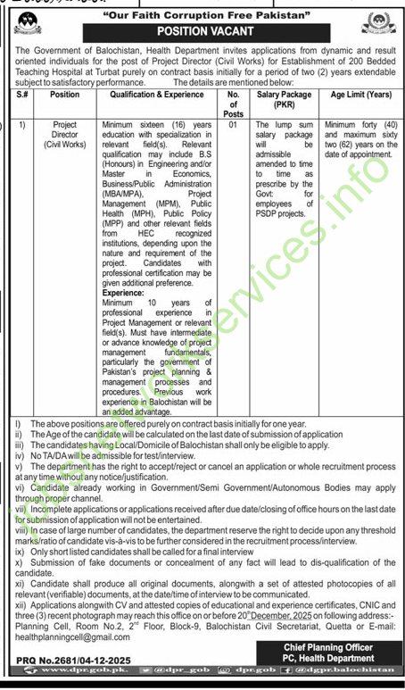 - How to Apply: Send the application package to the Planning Cell, Room No. 2, 2nd Floor, Block-6, Balochistan Civil Secretariat, Quetta OR email to healthplanningcell@gmail.com.