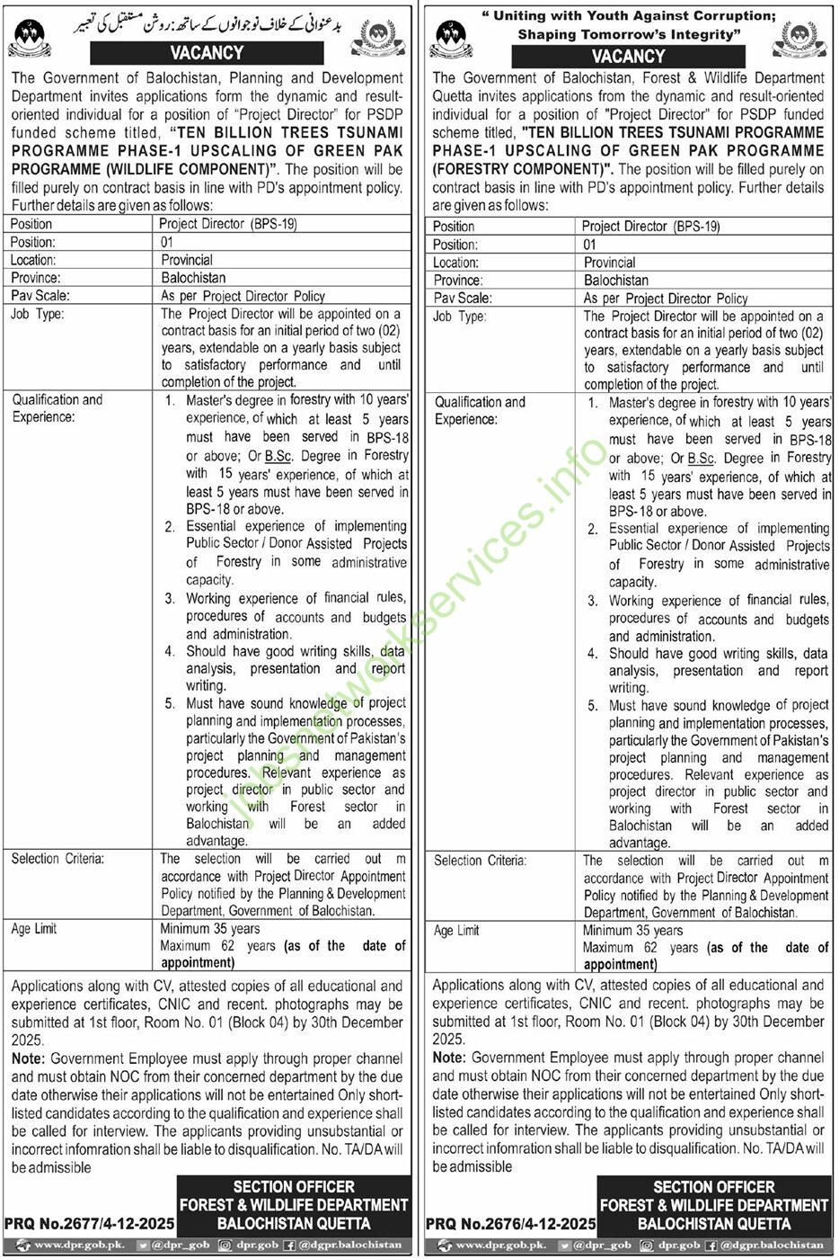 Vacancy announcements. It’s clear that these are two separate but highly similar positions for a Project Director (BPS-19) under the same overarching “Ten Billion Trees Tsunami Programme,” but managed by two different departments of the Government of Balochistan.