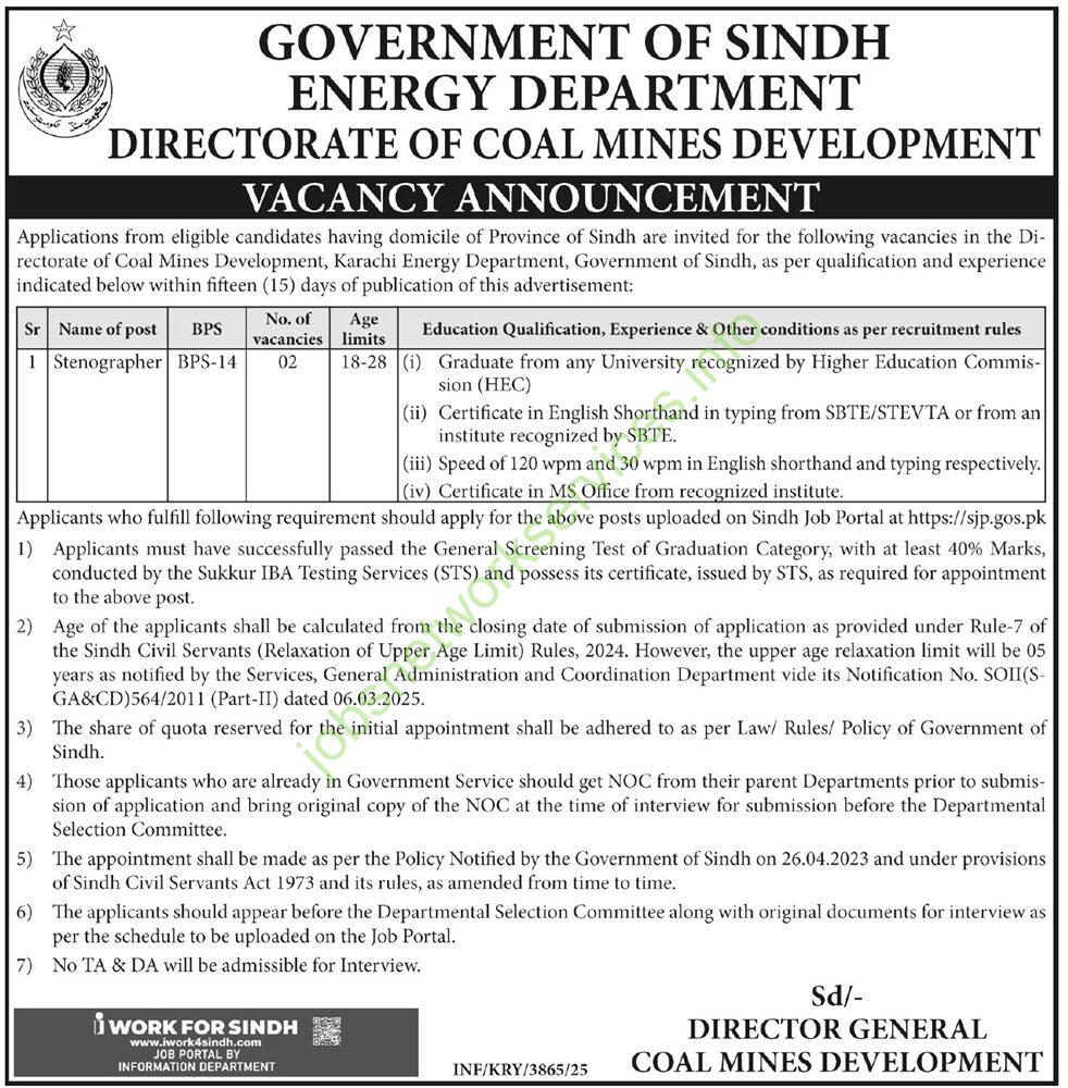 The Government of Sindh’s Energy Department, specifically the Directorate of Coal Mines Development, is hiring for two positions of Stenographer (BPS-14).