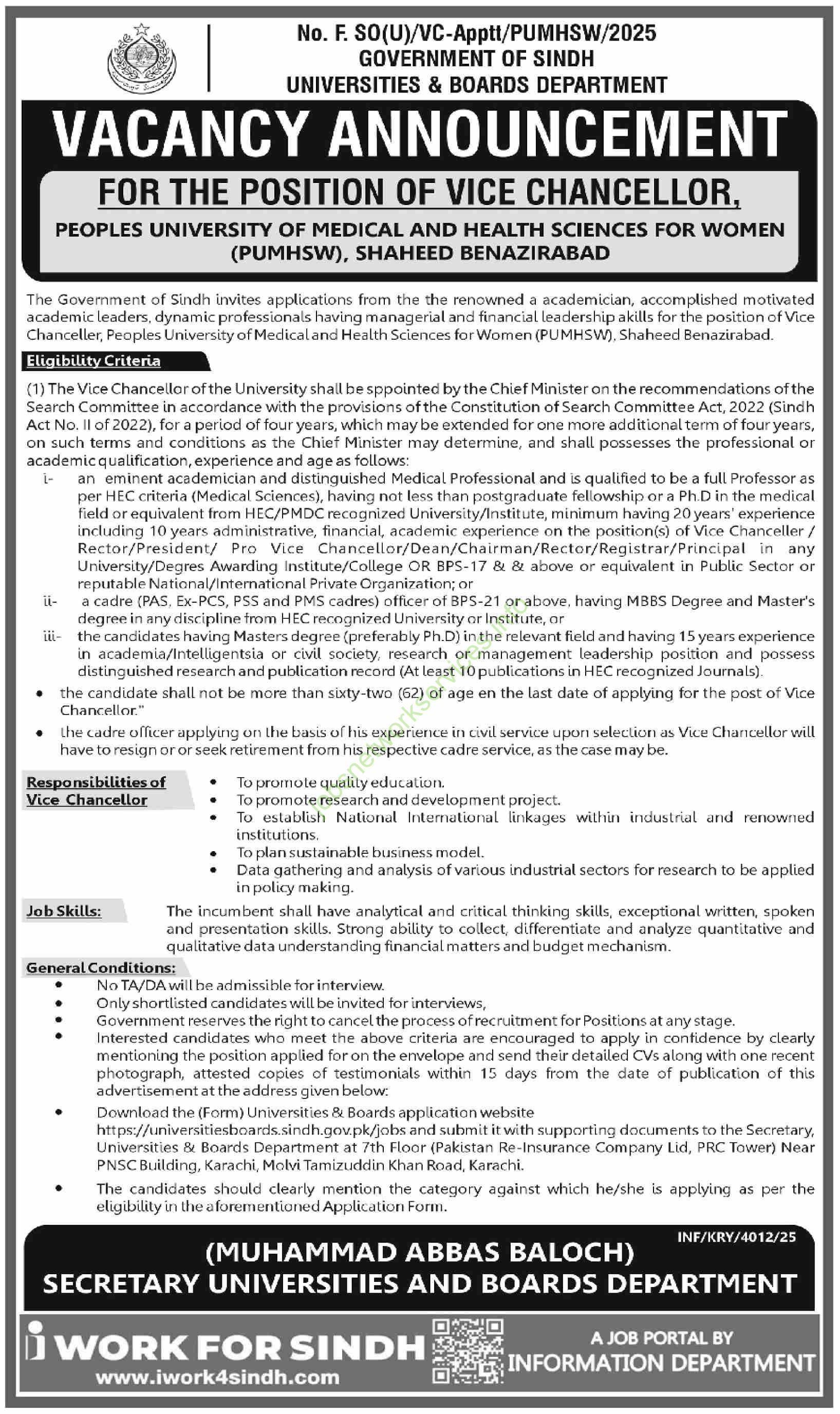 Here is a clear summary of the Vice Chancellor job advertisement from the Government of Sindh: