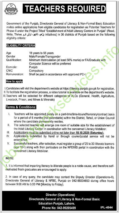 Government of the Punjab Directorate General of Literacy & Non-Formal Basic Education Jobs 2025