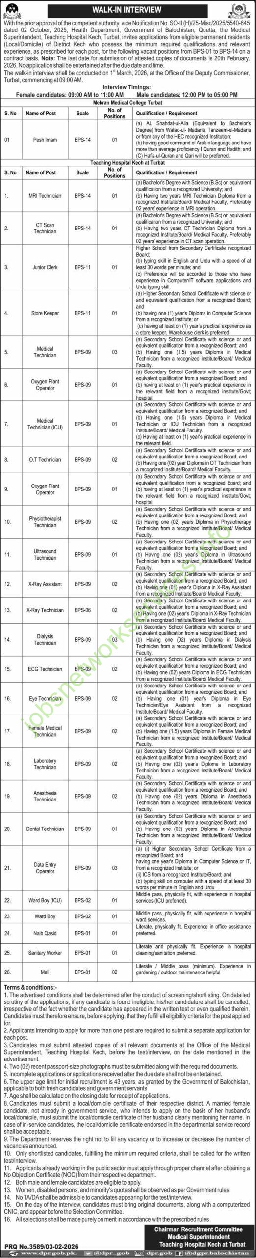 The Medical Superintendent of Teaching Hospital Kech, Turbat, invites applications from eligible permanent residents (Local/Domicile) of District Kech for various positions (BPS-01 to BPS-14) on a contract basis.