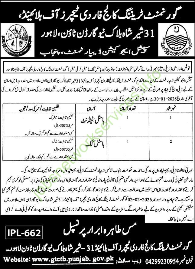 سپیشل ایجو کیشن ڈیپارٹمنٹ کے زیرے انتظام گورنمنٹ ٹریننگ کالج فار دی ٹیچرز آف بلائینڈ 31 شیر شاہ بلاک نیو گارڈن ٹاون، لاہور میں مندرجہ ذیل اسامی کے لیے ڈیلی ویج کی بنیاد پر بھرتی کے لیے درخواستیں مطلوب ہیں۔ درخواست کے ساتھ شناختی کارڈ، ڈومیسائل اور تعلیمی کاغذات کی مصدقہ نقول جمع کروانے کی آخری تاریخ 2026-01-30 ہے۔ اسامی کے لیے بھرتی کی اہلیت مندرجہ ذیل ہے۔