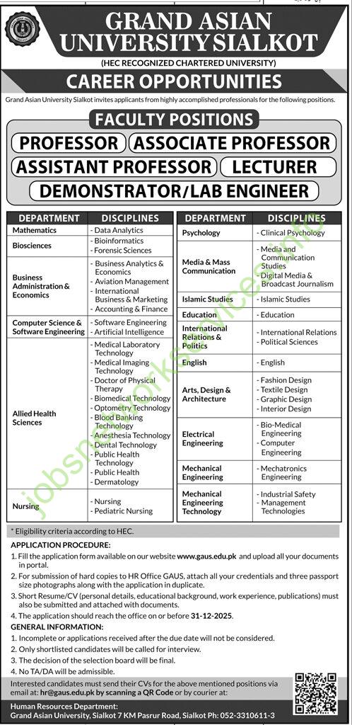 Here is a summary of the job advertisement from Grand Asian University, Sialkot: