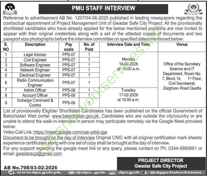 This advertisement provides interview details for the Gwadar Safe City Project Management Unit (PMU). This call is specifically for provisionally shortlisted candidates who previously applied under advertisement AB No. 1207/04-06-2025.