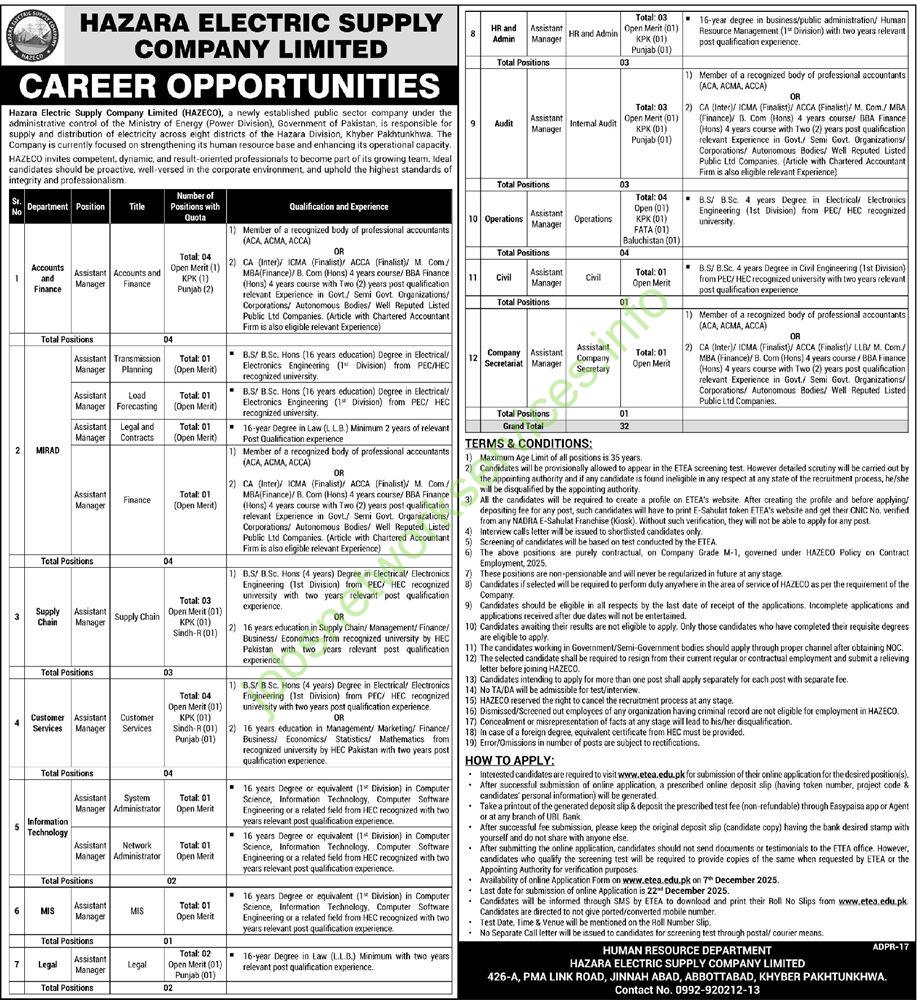 - Company: Hazara Electric Supply Company Limited (HAZECO) – a new public sector company under the Ministry of Energy, Pakistan.