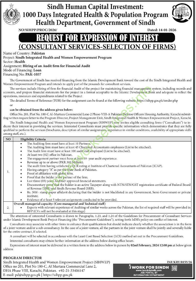- Detailed Terms of Reference (TOR):Available at https://sihpp.gos.pk/tender.php or obtainable in person from the address below.