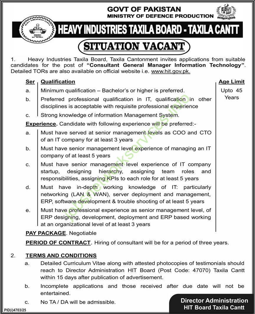 Job advertisement for Consultant General Manager Information Technology at Heavy Industries Taxila Board: