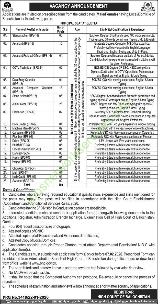 Here is a summary of the key details from the High Court of Balochistan Jobs 2026 vacancy announcement: