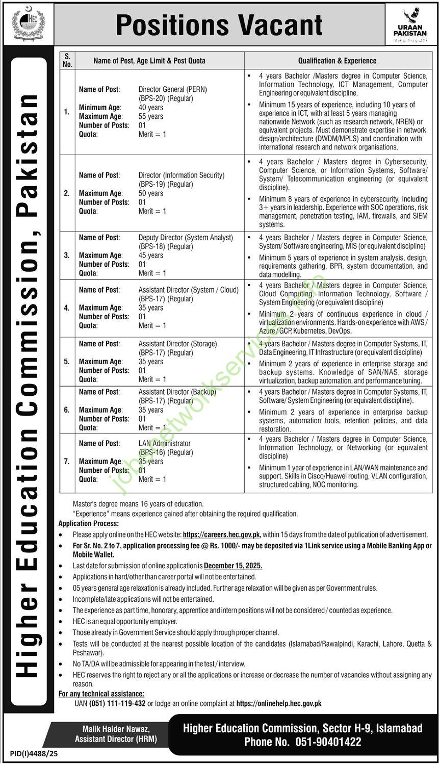 Here is a structured summary of the job advertisement from the Higher Education Commission (HEC) of Pakistan for December 2025: